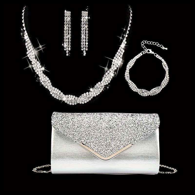 A Stylish And Versatile Elegant Sparkling Clutch Bag, Perfect For Evening Parties, Formal Events, With Exquisite Rhinestone Decorations, Including A Necklace, Earrings, Bracelet, And A Set Of Four Banquet Accessories.A Stylish And Versatile Elegant Sparkling Clutch Bag, Perfect For Evening Parties, Formal Events, With Exquisite Rhinestone Decorations, Including A Necklace, Earrings, Bracelet, And A Set Of Four Banquet Accessories.