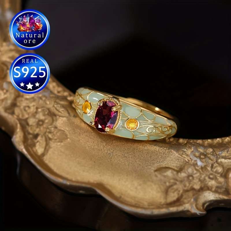 Elegant S925 Silver Garnet Ring with Adjustable Band – Vintage-Inspired, Mosaic Design, Perfect Gift for Mother’S Day, Natural Stone, Gift Box Included, 1.85g, Elegant Accessory | Vintageinspired Ring | Adjustable Band Ring