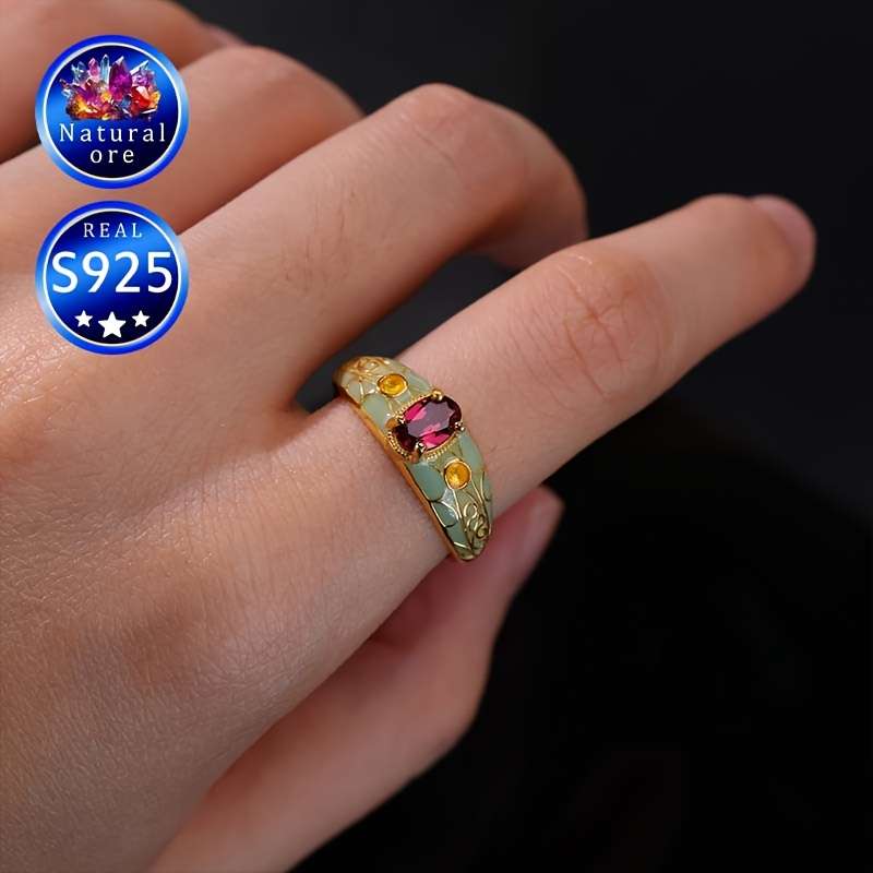 Elegant S925 Silver Garnet Ring with Adjustable Band – Vintage-Inspired, Mosaic Design, Perfect Gift for Mother’S Day, Natural Stone, Gift Box Included, 1.85g, Elegant Accessory | Vintageinspired Ring | Adjustable Band Ring